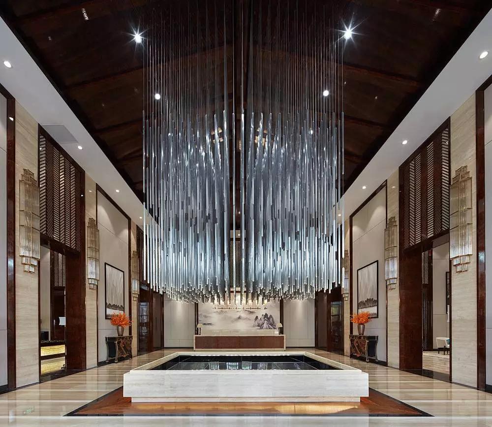 進(jìn)入大堂中心,便被一個(gè)奪人眼目的裝置藝術(shù)吸引,數(shù)百根不銹鋼條垂吊而下,宛如瀑布“飛流直下三千尺,疑是銀河落九天”,成為整個(gè)空間的視覺(jué)焦點(diǎn),啟動(dòng)后,水珠從不銹鋼滴落到地景的水中,呈現(xiàn)出“大珠小珠落玉盤”的動(dòng)感。