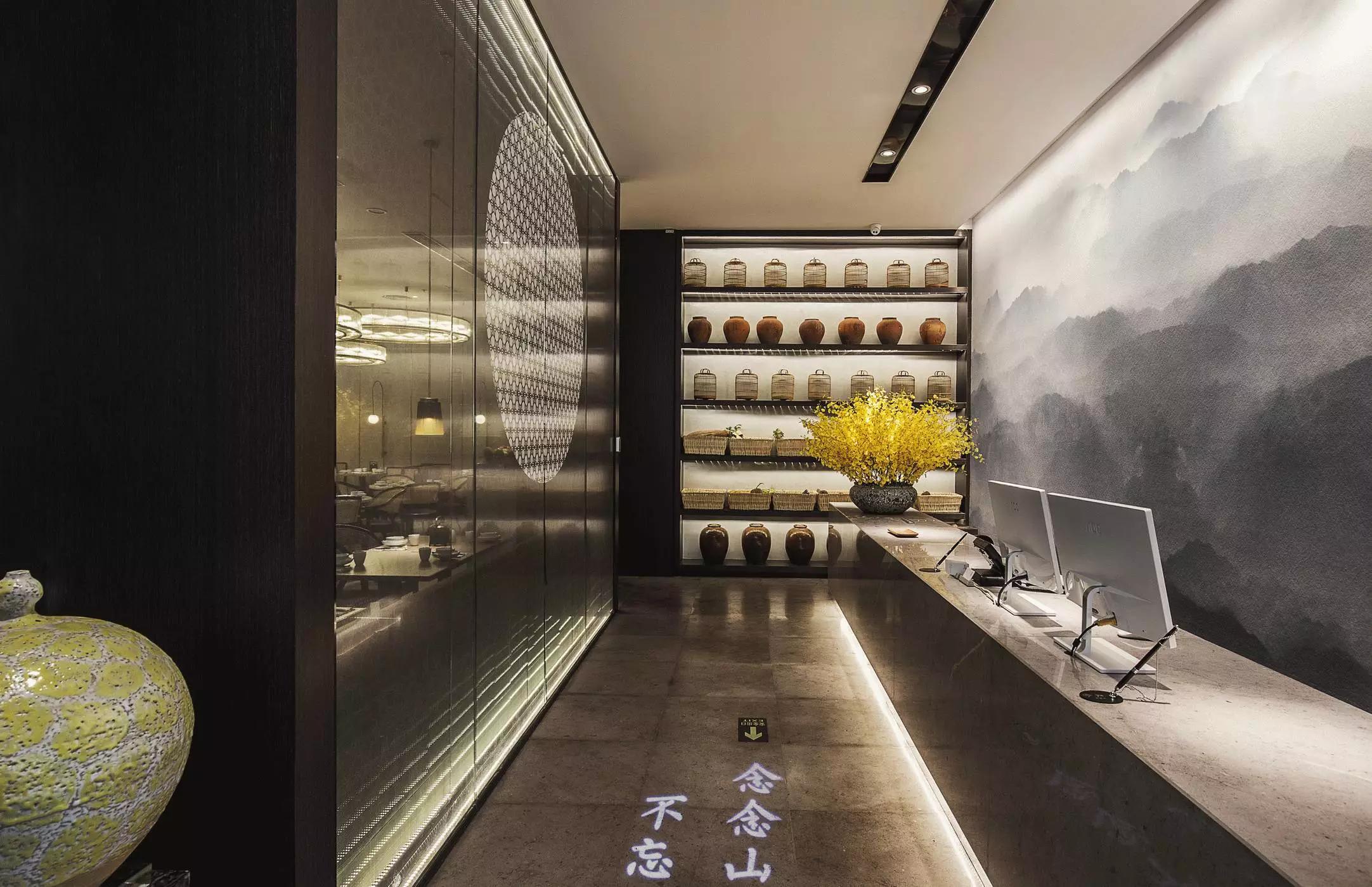 設(shè)計中廣泛使用了灰藍色調(diào)的石材,地磚,皮革,墻板,結(jié)合清新的藤編,厚重的木材,充滿質(zhì)感的不銹鋼以及別致的燈具和光線,讓整個空間既清新優(yōu)雅又不失質(zhì)樸,讓人雖身處鬧市卻仿佛置身于海的廣渺與山的深幽,又始終籠罩在一層淡淡的氤氳不去的“鄉(xiāng)愁”之中。