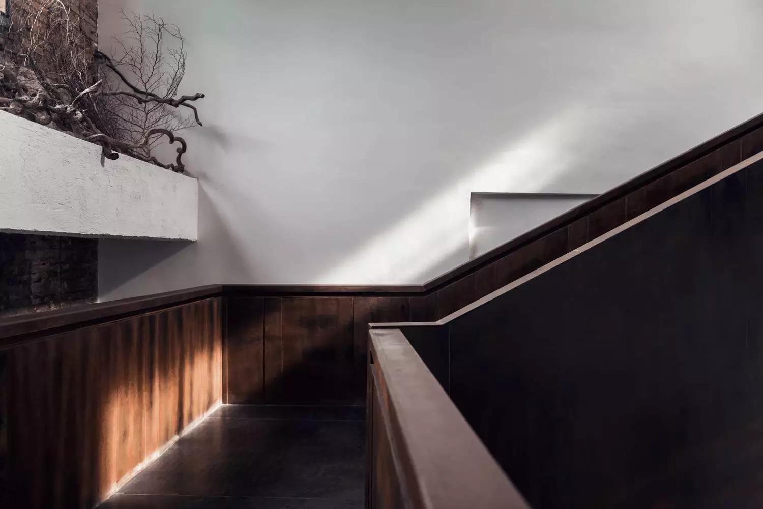 首層接待區(qū)是一個簡潔現代的空間,用以緩衝道路上的喧囂。訪客可以稍事停留,也可以順著樓梯自然而然的向上行走。