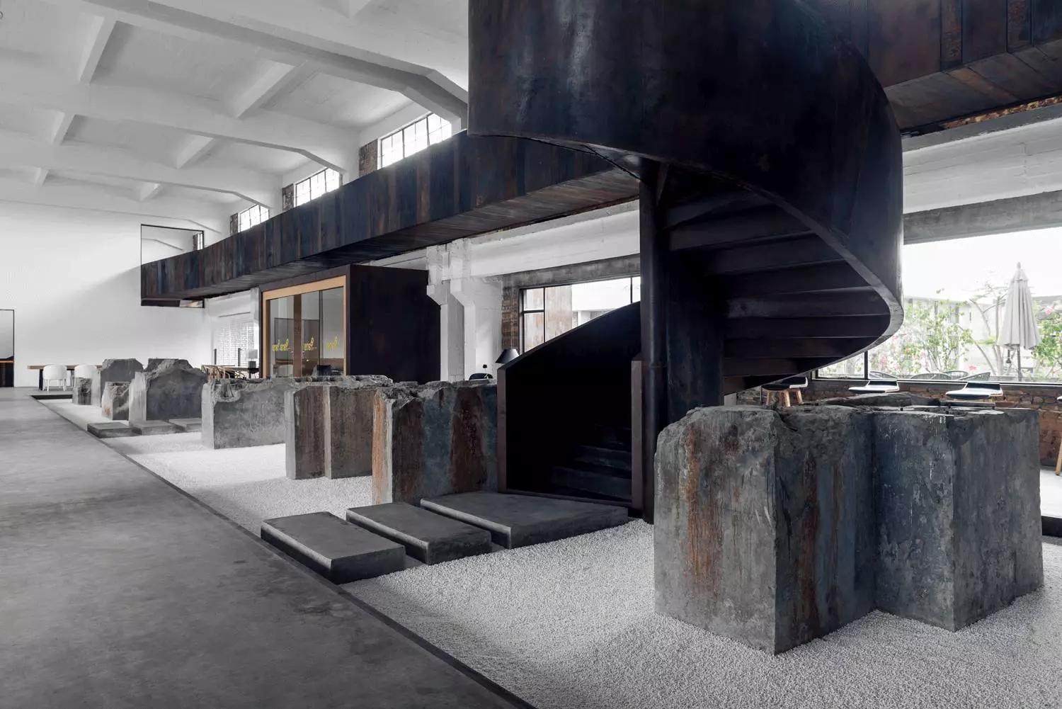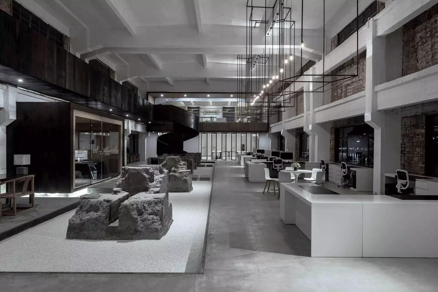 群組辦公空間保留的舊石墩是場所精神的集中體現,正是它,喚起了空間裡地方風貌的意象。