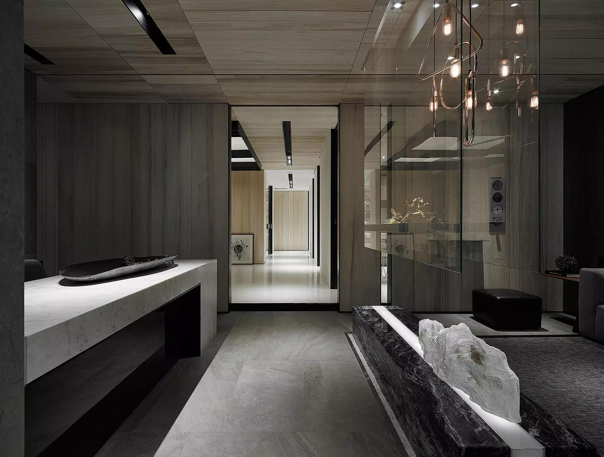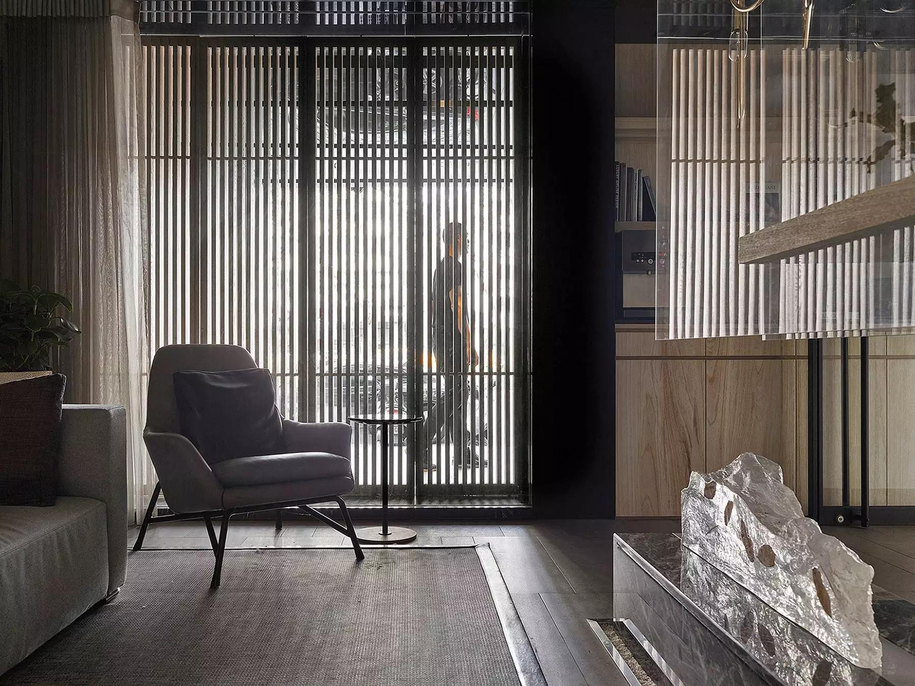 將玄關(guān)刻意退縮于室內(nèi)、入口大門轉(zhuǎn)向,而產(chǎn)生一進(jìn)一景之空間體驗層次,寬闊的騎樓面積與門口的虛空間,未踏入空間卻已感受沈穩(wěn)安定。