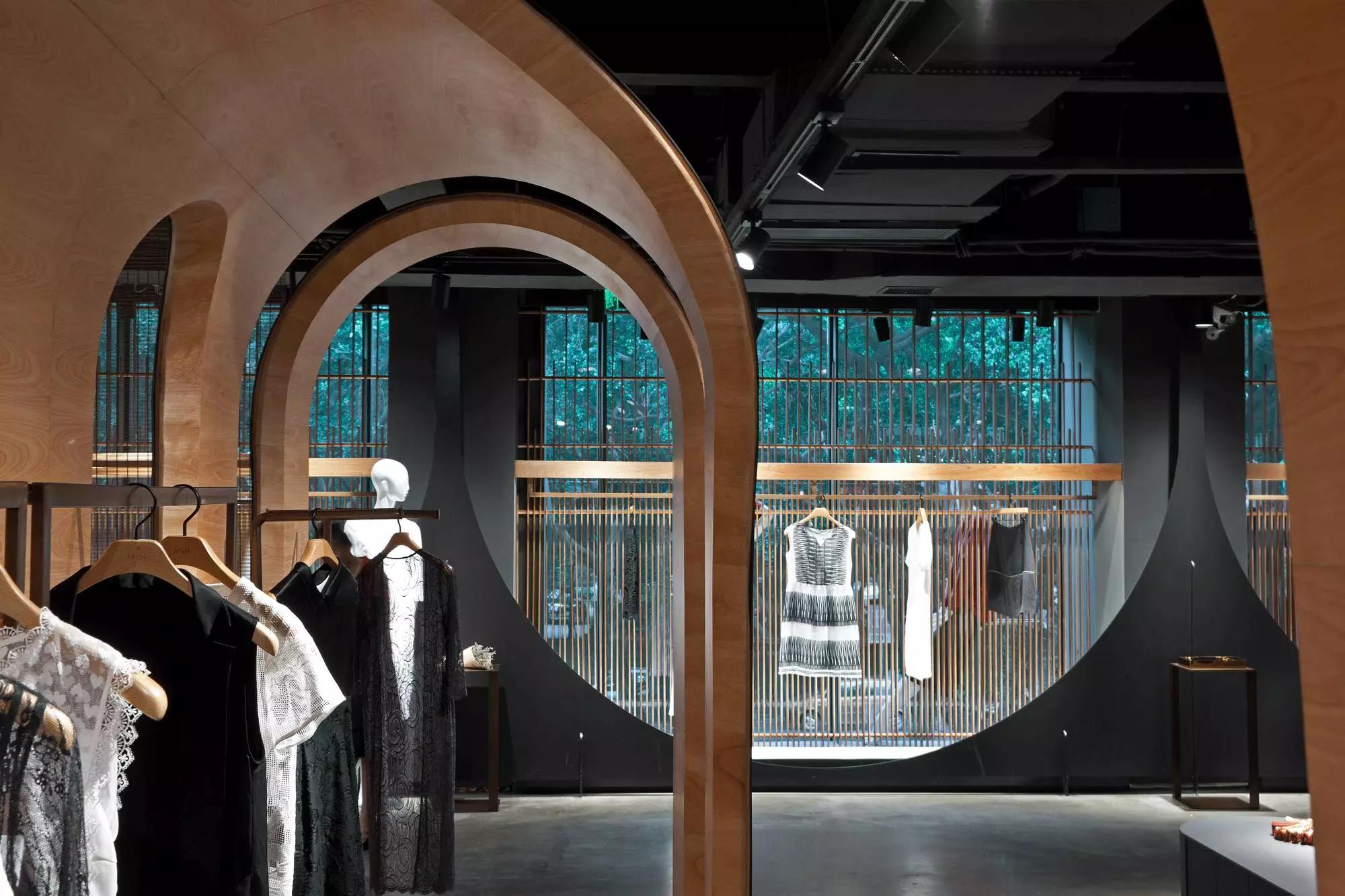 和一般常規(guī)服裝店陳列的概念不同,新的店鋪概念強調(diào)建筑化的零售模式。纖細的木屏風(fēng)結(jié)合貨架矗立在邊界處,渲染了空間和室內(nèi)飾面的豐富多樣性,建筑元素顯露材質(zhì)原始的質(zhì)感,烘托服裝的品質(zhì),這種手法為整個店鋪灌注純粹的氣氛,隱喻品牌的精神。天井樓梯釋放出不同光影效果,使整個空間與建筑取得一種時間與空間的對話。設(shè)計中,我們直白的將不同的“拱”垂直交疊,希望在垂直空間上制造不同的空間與體驗。這個特殊的表現(xiàn)方式給人們提供強烈的視覺效果。依據(jù)商業(yè)需求,采用模塊式設(shè)計,這樣可以使品牌不同功能具有最大的靈活性。