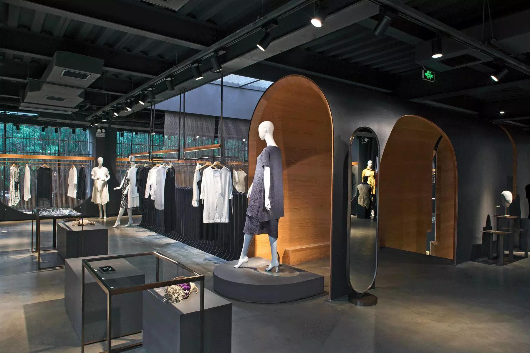 內(nèi)部空間希望呈現(xiàn)一種原始野性的魅力,采用鋼制的表皮帶來一種現(xiàn)實感。這種“直白”式的架構(gòu)材料,空間所形成的直接性與樸素性,加上大尺度的鋼板落地產(chǎn)生的力量感或輕盈感,使整個空間與原有場地建筑取得一種時間與空間的接續(xù)關(guān)系。利用“拱”多變的空間特性,產(chǎn)生不同的空間,打破了均質(zhì)的體驗。這是一個回憶的過程,再一次將建筑的體量與空間對話,越是簡單的形體邏輯,越能給人帶來深刻的印象,弧拱曲線柔和,呈現(xiàn)不同角度的美感?;」暗倪B續(xù)曲線把空間構(gòu)造成圍合區(qū)域,在這樣的方式下,內(nèi)部和外部保持著空間的連續(xù)性,這個理念使空間不拘泥于常規(guī),探索傳統(tǒng)類型空間的新秩序,"拱"在傳統(tǒng)建筑中扮演重要角色,并且在漫長的歷史中不斷豐富。我們試圖轉(zhuǎn)化傳統(tǒng)"拱",讓"拱"在均質(zhì)呆板的現(xiàn)代空間上制造新的突破,獲得自然能量并把它轉(zhuǎn)化為空間秩序。濃烈的空間美感,顯示該品牌的重要意義?;」巴臻g一、二層相連,創(chuàng)建出有趣的空間狀態(tài),吸引顧客的好奇心。