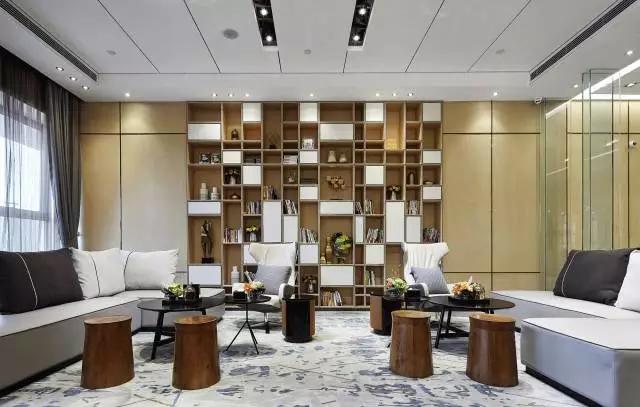 接待前廳:木制線條勾勒出自然光影變幻,原木的質(zhì)樸粗糲與細(xì)致的金屬線條對撞出現(xiàn)代美學(xué)趣味,生動有趣的屏風(fēng)和燈飾,石材與金屬板映襯出明暗互動,虛實掩映的空間氣質(zhì),輕松雅致是設(shè)計者締造氛圍的關(guān)鍵。